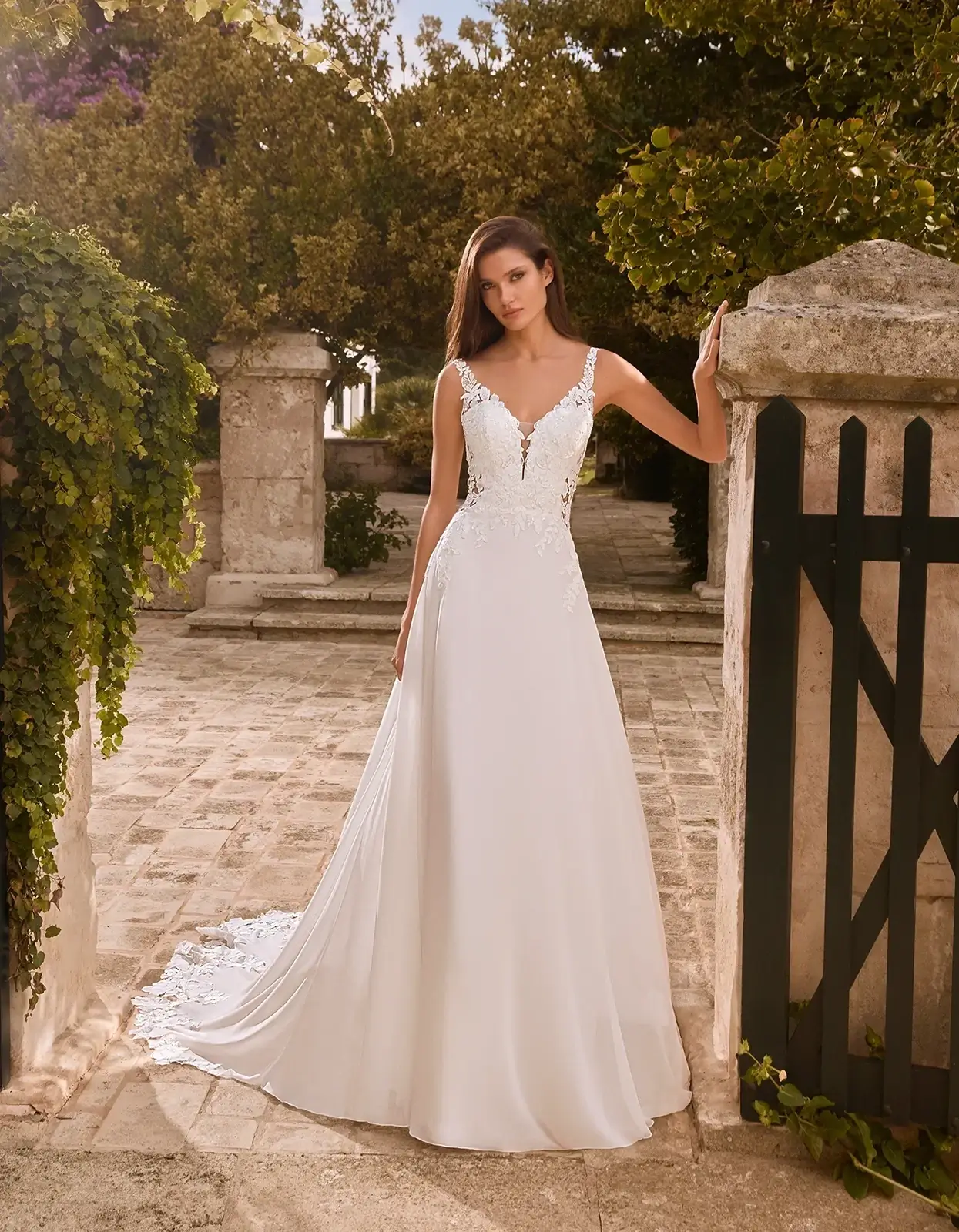 Robe mousseline de style romantique aux courbes parfaites, corsage en forme de V réalisé avec application de dentelle. Magnifique traine ornée de dentelle.