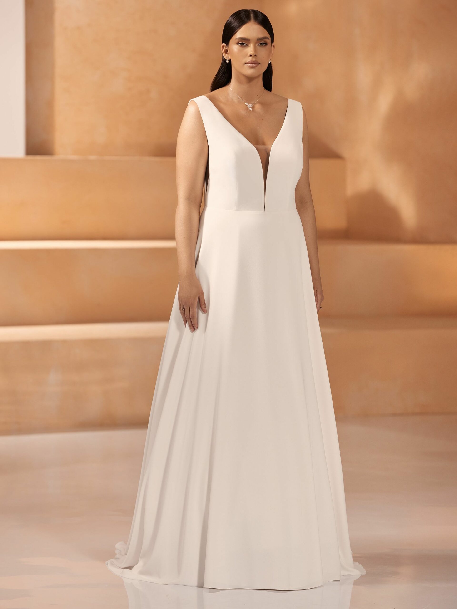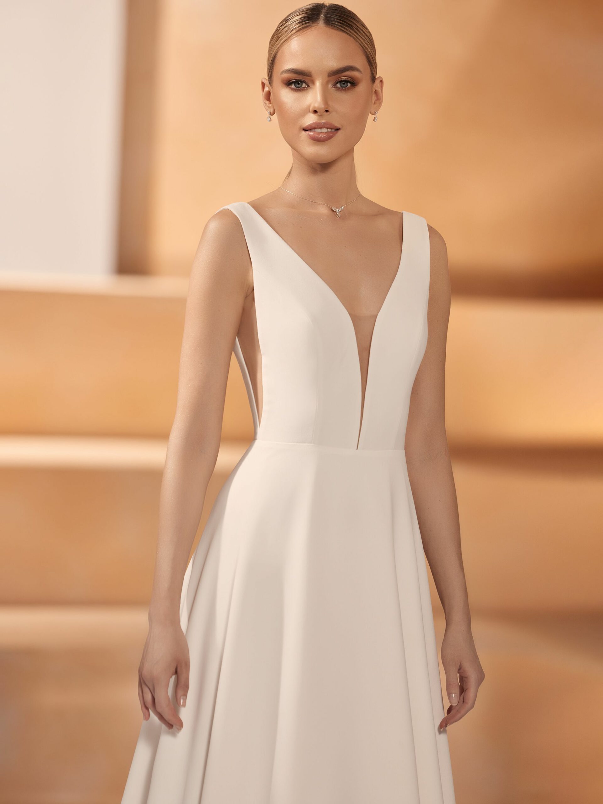 GOBI apporte une touche romantique avec son décolleté en V devant et dans le dos. Cette robe, sans manches, est un excellent choix pour un mariage. La robe est en crêpe lourd.