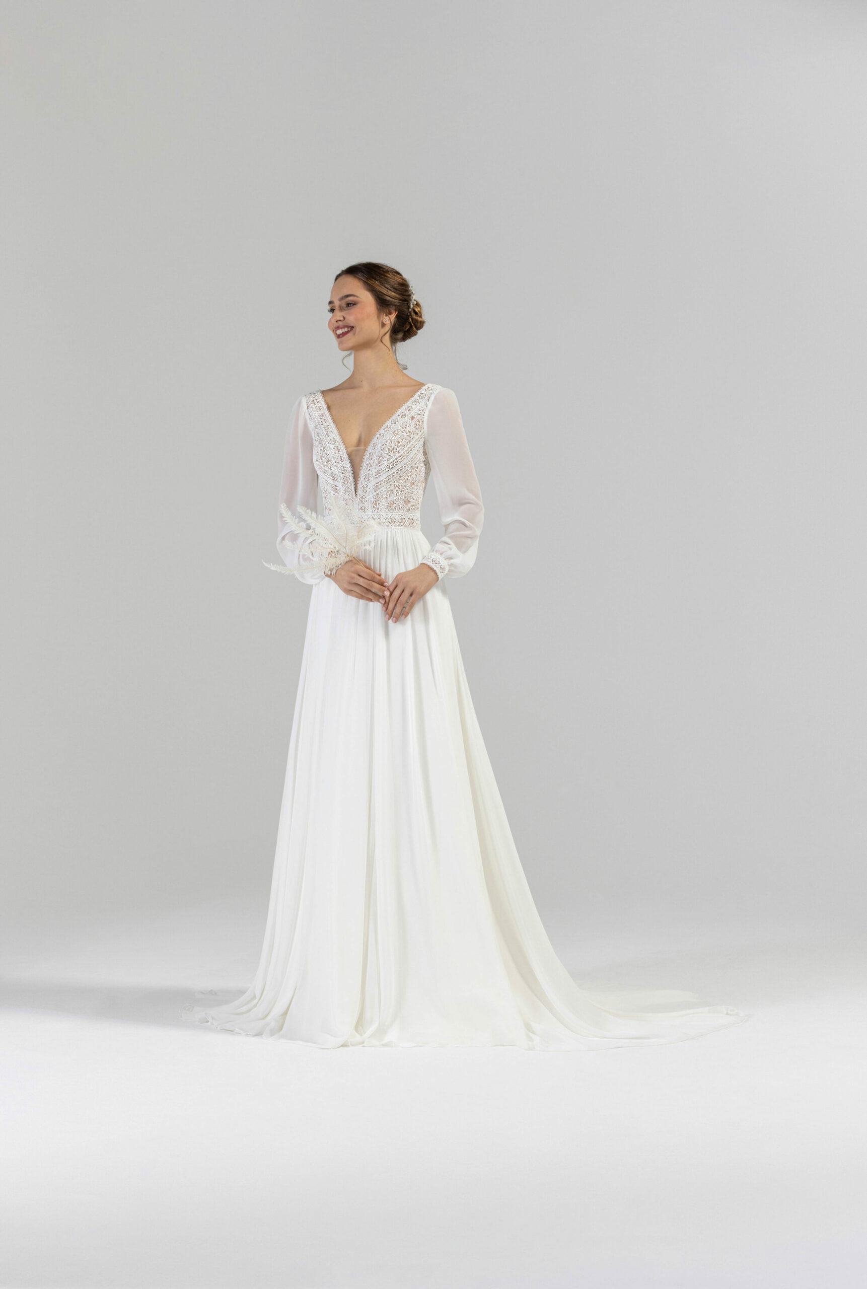 Une iconique Églantine ! Cette robe de mariée en mousseline à manches longues présente un bustier en V couvert de guipure et une taille haute d’où part une jupe vaporeuse. Un modèle délicat et bohême.